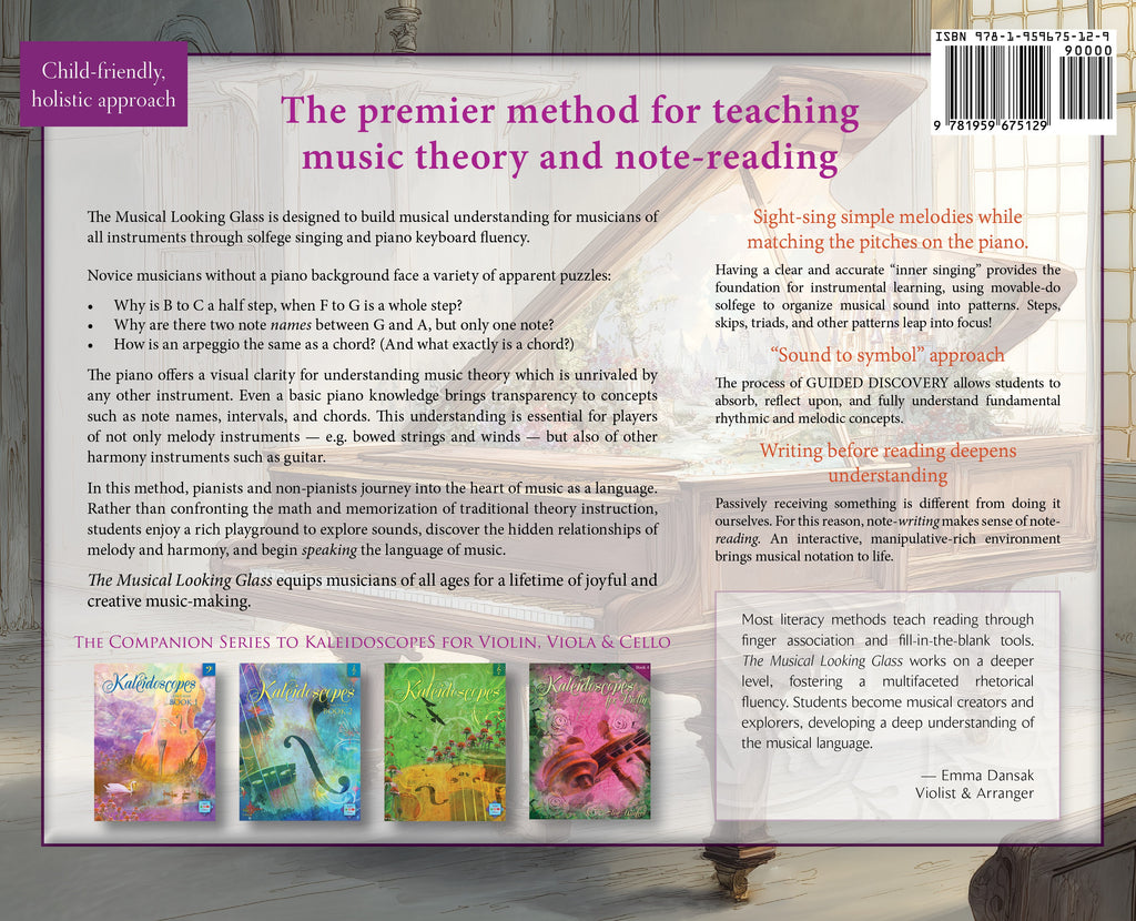 The Musical Looking Glass: Note-Reading & Early Piano Fluency Through Singing, Guided Discovery, and Creative Play, by Hollie Thomas & Elise Winters, builds musical understanding for musicians of all instruments through solfege singing and piano keyboard fluency.